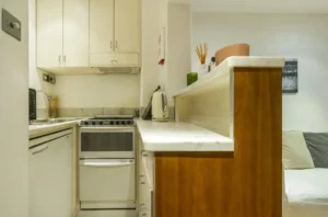 The apartment features an open plan living room with kitchen area, double bedroom with built in storage and ensuite bathroom.